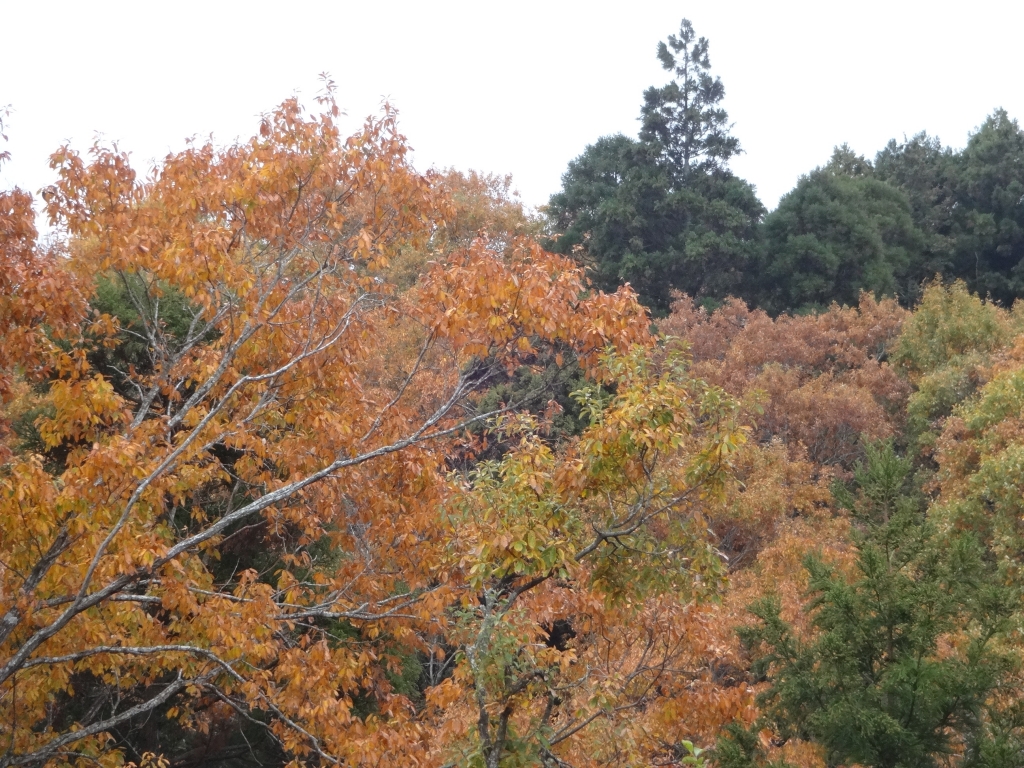 今日の昭和の森は曇っています。風は少し、肌寒いです。 緑色だった森に黄色が目立つようになってきました。コナラやクヌギの葉の紅葉が進んでいるのです。曇り空の下では暖色が落ち着いて見えます。