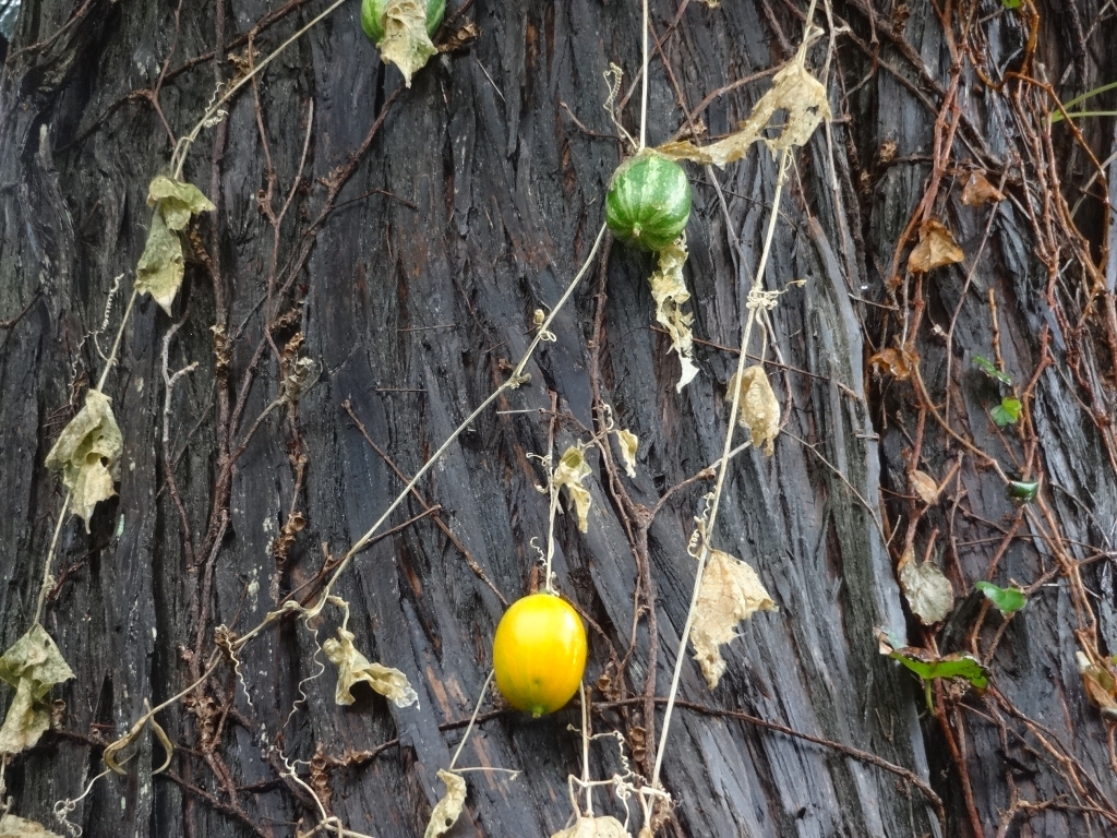 今日の昭和の森は晴れています。雲が多いです。風は弱く暖かです。 カラスウリが色づき始めています。同じツタでも熟れるスピードが違うようです。一つは緑で小さなスイカのようにも見えますが、片方は黄色くなっています。他の場所では赤くなっている実もありました。植物も人間も、親が同じでも異なる個性。違いを尊重していい所を伸ばしてやりたいですね。