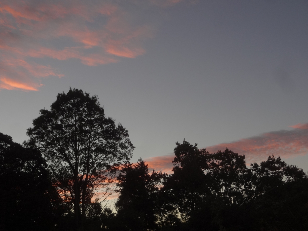 今日の昭和の森は晴れています。午前中は雲が多かったのですが、快晴となってきました。 秋です、朝は冷え込みました。周辺家庭のエアコン室外機の回転音からすると、暖房を入れていたようです。写真は早朝の朝焼けです。日の出も遅くなってきましたが、日の入りの方がもっと早くなっています。夜が訪れるのが早いので、良い子は早くおうちに帰りましょう。