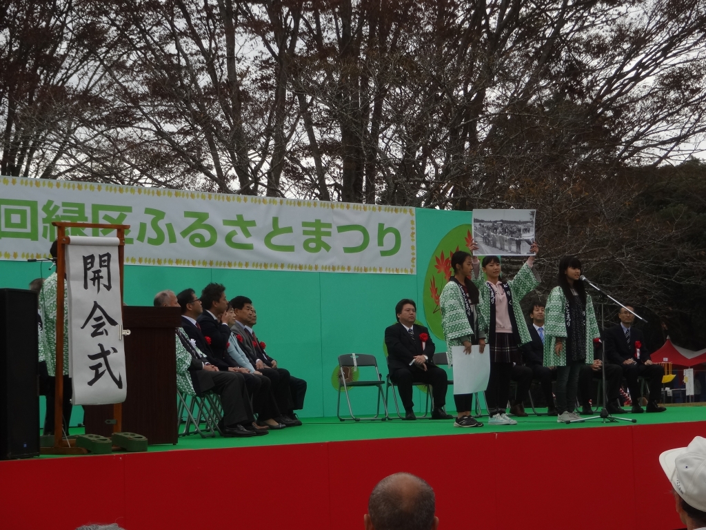 今日の昭和の森は曇っています。少し肌寒さがありますが、動き回るレジャーには最適です。 太陽の広場北側では千葉市緑区のふるさとまつりが開催されています。来賓あいさつの後、土気中学校の元気な生徒の開会宣言でスタートしました。ステージの出し物だけでなく、模擬店やミニゲームを楽しめます。
