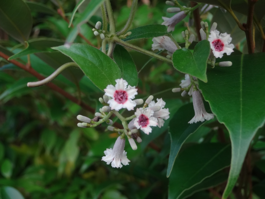 今日の昭和の森は曇っています。昨日午後のスコールもあり、しっとりどんよりした朝です。おかげで涼しくてすごしやすいです。これまで、暑い暑いと言ってきましたが、もう8月も中旬。お盆を迎えた後は、秋進行です。 ヘクソカズラの白い花です。中央部は深い赤です。こんな可憐な花なのに、不名誉な名前が付いています。確かに葉や茎は若干の臭気がありますが、名につける程ではありません。秋には褐色の実になります。