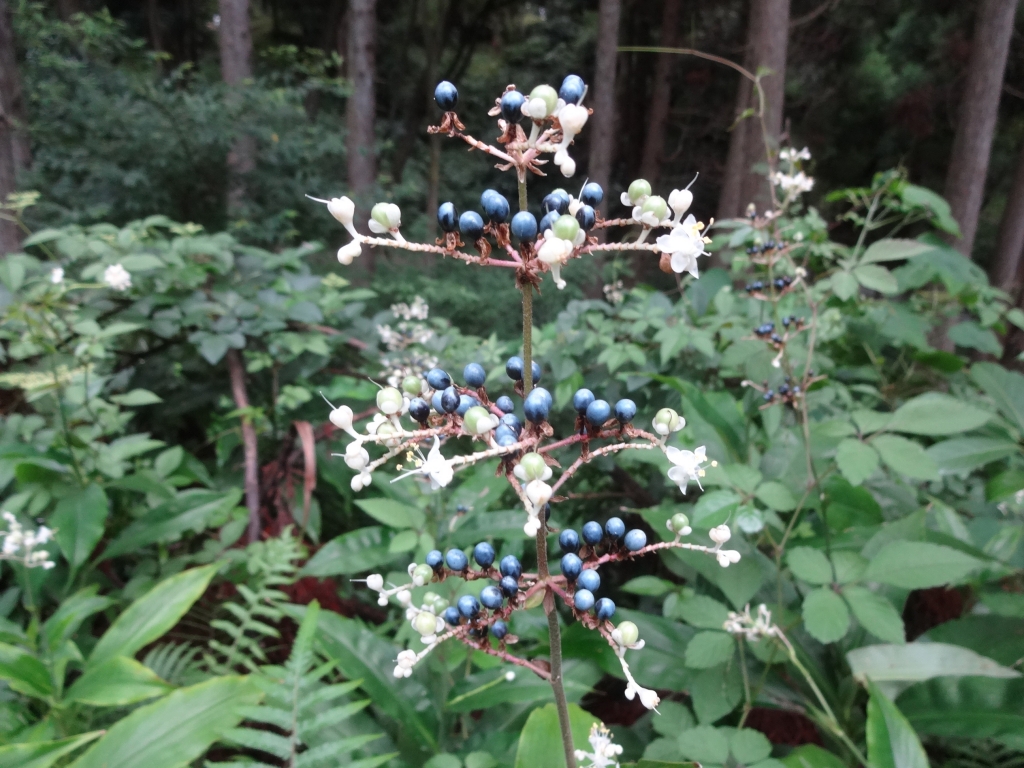 今日の昭和の森は晴れています。涼しい朝を迎えました。九月の空と言ってもいい清涼さです。暑い時のままのスタイルだと風邪をひくので、ご注意ください。 白い花をつけていたヤブミョウガが黒い実に変わってきました。まだ白黒のまだら模様ですが、野山は一足先に秋を迎えています。夕方は、秋の虫もたくさん鳴くようになってきました。