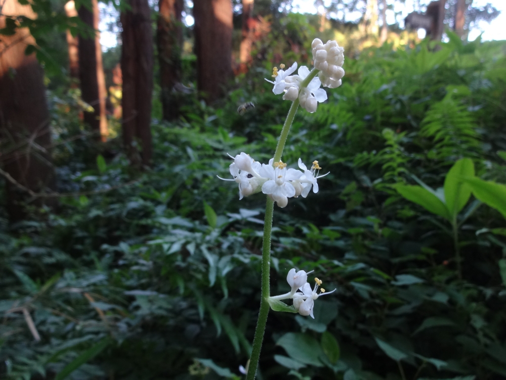 今日も昭和の森は晴れています。風は殆ど無くとても暑いです。空は快晴から薄曇りに変わってきました。上昇気流は多いはずなので、時雨や夕立が欲しい所です。 さて、いくらか気温が低い林間では、ヤブミョウガの白い花が咲いています。咲いている期間が長い花です。もう少しすると、青黒い実になります。