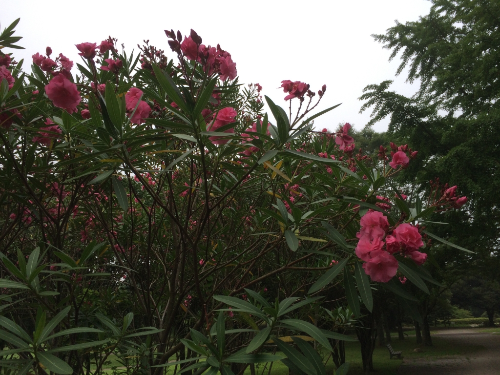今朝の昭和の森は曇っています。幾分涼しく感じます。これから晴れてくるのでしょうか。 キョウチクトウが咲いています。夏に相応しい鮮やかな紅色ですが、あいにくの曇り空で冴えないです。