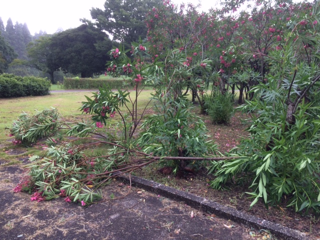 今日の昭和の森は曇っています。台風一過、湿度の高い朝です。これから晴れてくるのでしょうか。 強い風で倒れている木があります。幹の細い夾竹桃がぱたりと倒れていました。木の上から落ちかかっている枝もあるので、林間を散策する時は、ご注意ください。