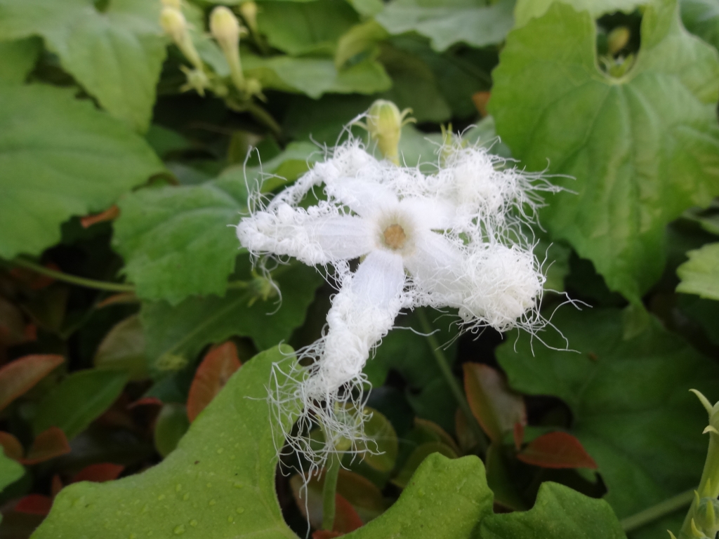 今日の昭和の森は晴れているようですが、薄曇りです。上空に水蒸気がたまっているようです。今日も「命にかかわる」ような暑い日です。 マスコミは連日この原因を面白がって報道していますが、抜本的な対策は何でしょうか。よく、「地球が危ない」と言われますが、危ないのは、「人類」だそうです。地球は問題ないが、人類は滅亡するかもしれないと言うだけ?のようです。 さて、カラスウリの不思議な形の白い花が咲いています。糸がほつれたような髭もじゃのような爽やかではない姿です。本来、夜咲く花なのですが、朝方...