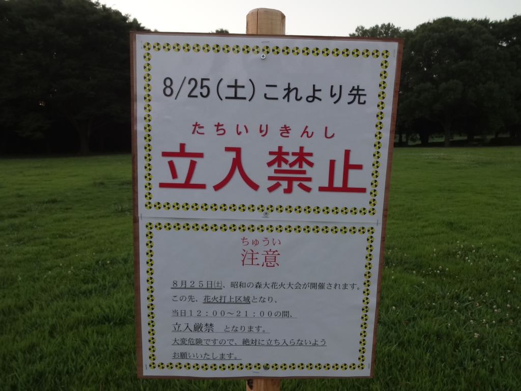 今日の昭和の森は晴れています。ミルキーブルーの空です。とても蒸し暑いです。 もう8月25日の花火大会の立札が立っています。それも単なる告知案内ではなく、「立入禁止」です。ちょっと早や過ぎませんか?犬の放し飼いなど社会ルールが守れない人が多い来園者に倒されたら、また手間がかかります。売店の横には、下のようなポスターが貼ってありますが目立たないですね。