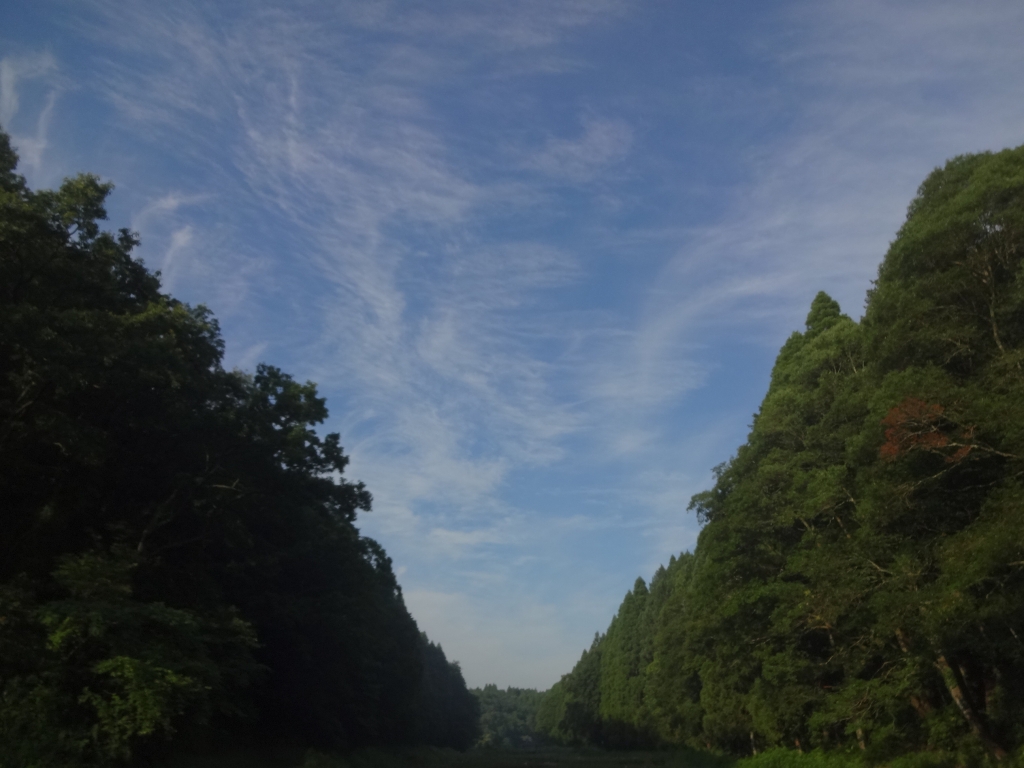 今日の昭和の森は晴れています。穏やかで気温上昇し真夏日になりそうです。 早朝のV字型の青空です。サッカー日本チームも一試合一試合の「V」を目指していることでしょう。朝の雲は高い所にあり、まだ夏雲の様子はありません。これから上昇気流が増えると薄くミルクがかったような空になるでしょう。