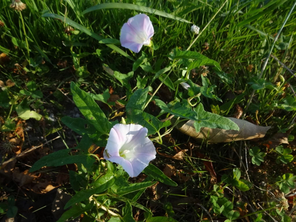 今日の昭和の森は晴れています。風は少し、暑いです。 白に紫が入った五角形のラッパ状の花が咲いています。朝顔でしょうか。この形の花も色々あるようです。