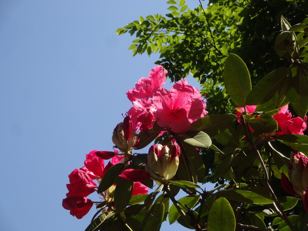 今日の昭和の森は晴れています。次第に雲が増え風が吹いています。皆さん、無事に楽しく休日を過ごされたでしょうか。 紅いシャクナゲが咲いています。青空との対比が鮮やかです。大柄の花なので大女優のようです。