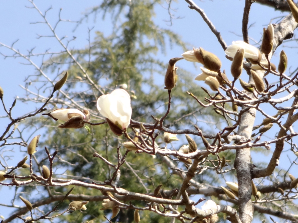 今日の昭和の森は、雨上がりで快晴です。今朝は冷え込み、一部では氷が張っているところもありました。少し風が吹いています。 ここ数日の陽気で木々の芽吹きが進んでいます。春を告げる花、コブシも咲き始めました。コブシと言えば、千昌夫ですかね。次は、カタクリ、桜と続きます。