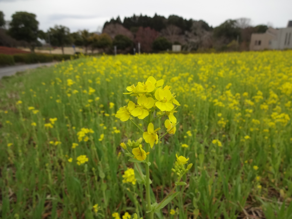 今日の昭和の森は、小雨模様です。寒くはないですが、風が吹いています。 第2駐車場に向かう丘にある菜の花畑です。曇り空でも、この一帯だけは明るい花園です。