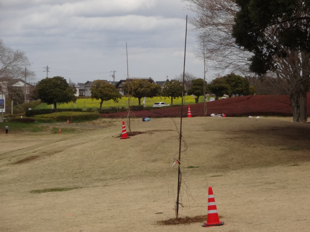 今日の昭和の森は、晴れのち曇り。朝は晴れていたのですが、曇ってきました。今週前半は、このままパッとしない天気のようです。 東京では、桜が開花したそうですが、太陽の広場とその周辺では「さくらの植栽」が行われました。公益財団法人日本さくらの会から100本寄贈されたそうです。こんもりした丘の上にも植えられたので、木が大きくなったら景色が変わりそうです。
