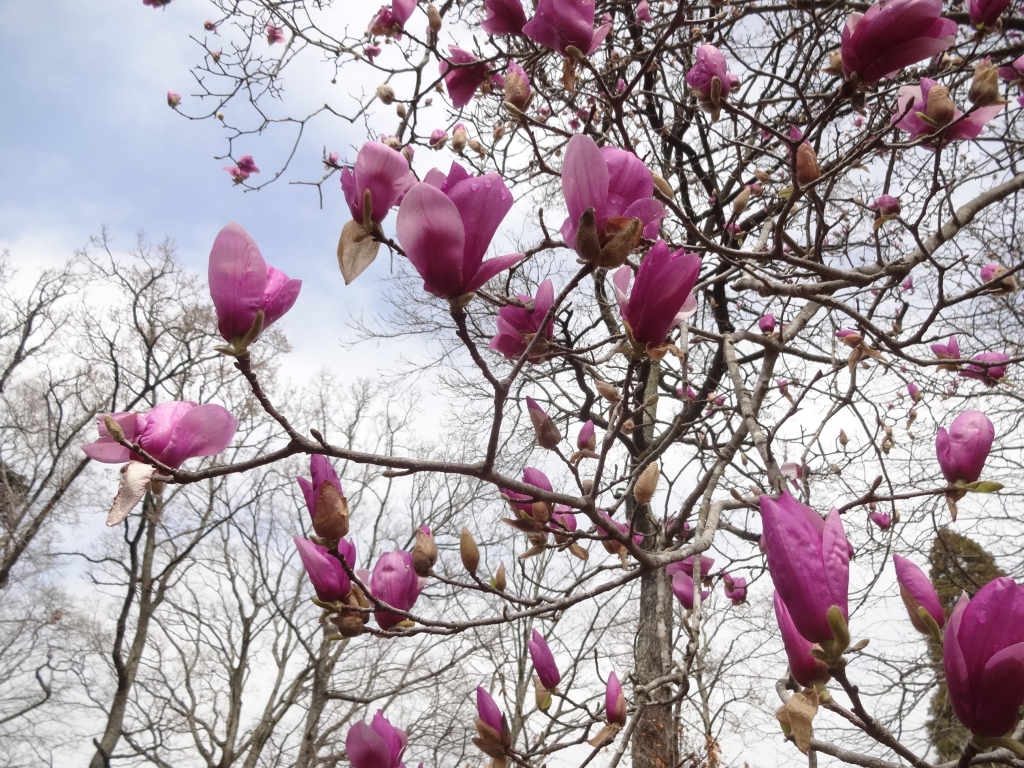 今日の昭和の森は晴れていました。暖かいどころか暑いくらいでした。桜も一気に咲いてきました。 しかし、モクレンも忘れてはいけません。ハクモクレンは清楚ですが、モクレンと言えば、この紫色。