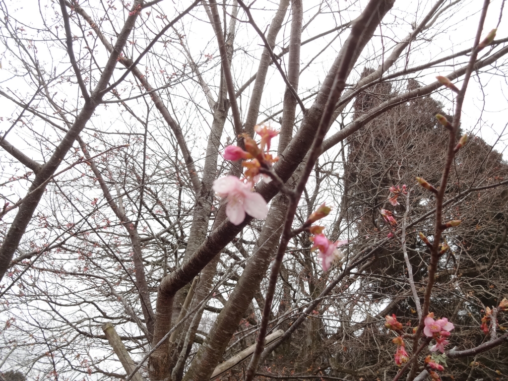 今日の昭和の森は、昨日から一転して寒い曇り空でした。こういう季節の変わり目は、体調を崩しやすいですね。 しかし、この寒さの中でも、着々と春の準備は進んでいます。彼岸桜だと思うのですが、ぽつぽつと咲き始めています。