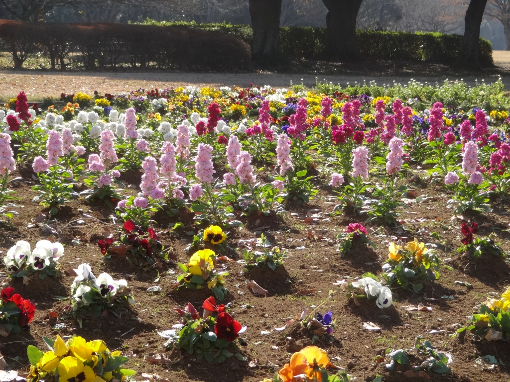 今日の昭和の森は快晴です。日差しが明るく穏やかです。展望台から見ると、東の海上に雲が多くあります。 第1駐車場から上って太陽の広場付け根の花壇です。カラフルの彩の花が陽光に照らされて輝いています。花壇は第1入口、売店の前や園外ですが住宅地に渡る横断歩道の先にもあります。