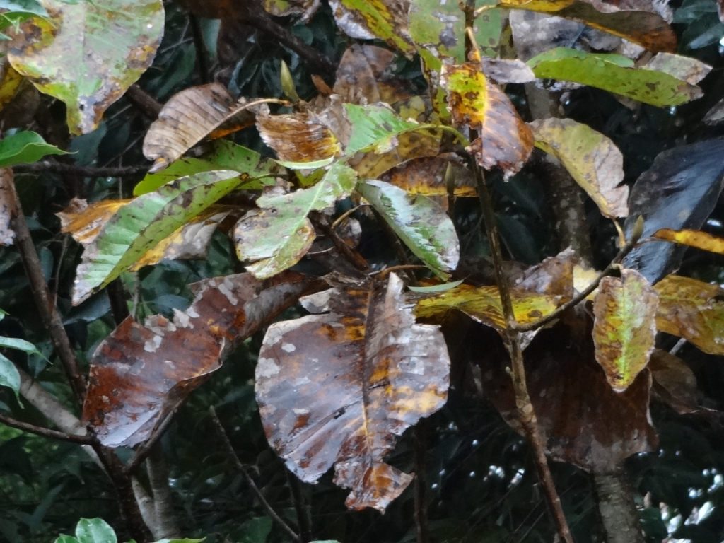 今日の昭和の森は雨です。 少し風が吹いています。 ホオノキの葉は、とても大きく 夏の間は生命力にあふれています。 しかし、秋になり枯れてくると、 その大きさゆえ無残な姿です。 雨に濡れると更に哀れです。 早く葉を落としてしまった方がいいですね。