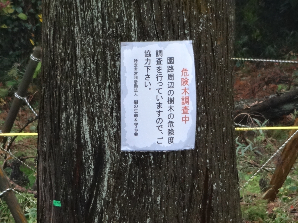 今日の昭和の森は曇っています。 穏やかです。 午後には晴れてきそうです。 昭和の森では、「危険木調査中」のようです。 木にご覧のような紙が貼ってあります。 先日の台風で木が何本か倒れました。 公園の周辺では、 倒れた木で被害にあった住宅もあるようです。 2年前の台風で倒れた木も放置されおり、 早急な整備・伐採が望まれます。