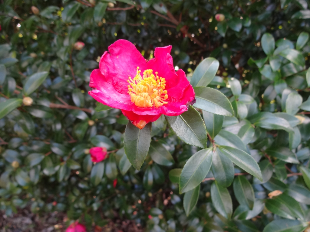 今日の昭和の森は曇っています。 天気予報では晴れなのですが。 穏やかで暖かな朝です。 生垣に紅い花が目につくようになってきました。 サザンカです。 冬の花というイメージですが、 秋から春先まで咲いています。