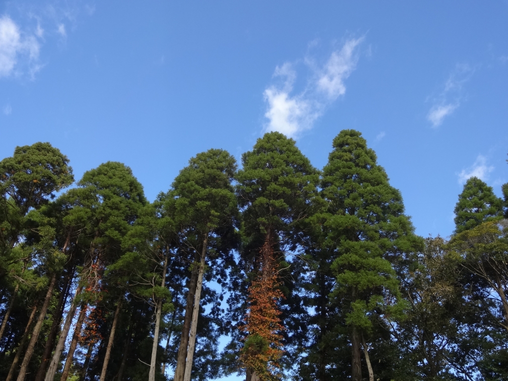 今日の昭和の森は晴れています。 台風は過ぎ去りましたが、風が吹いています。 南の方向は雲が多いです。 南海上を前線が移動しているためでしょう。 昭和の森は、以前植林したのでしょうか、 杉林が多いです。 その杉林の下から見上げる青空は、 とても高く感じます。