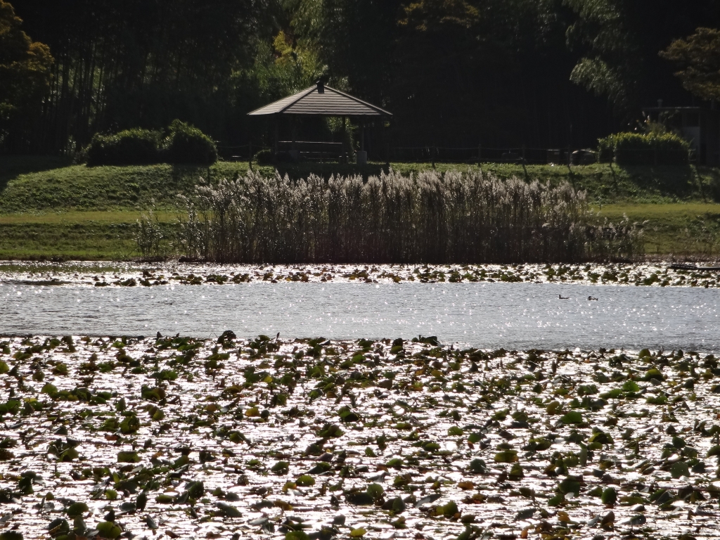 今日の昭和の森は晴れています。 今朝は冷えました。 まだ、少し風が吹いています。 太陽の緯度が低くなってきたので、 下タ田池の水面が、より輝くようになってきました。 睡蓮と葦と四阿。 冬のような風情でした。