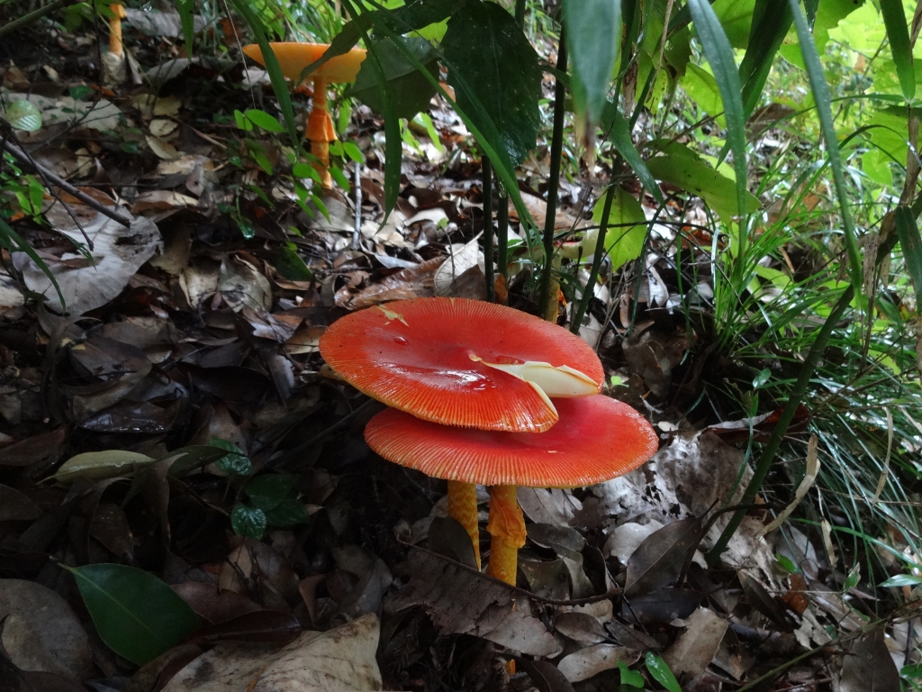 今日の昭和の森は曇っています。 昨夜の雨は上がりました。少し風が吹いています。 秋と言えば、キノコ。 暗い森の中では夏前から生えていますが。 ここのところの気候は、晴れたり雨が降ったりなので キノコ多く生育していいます。 笠が大きく鮮やかなキノコが連なっていました。