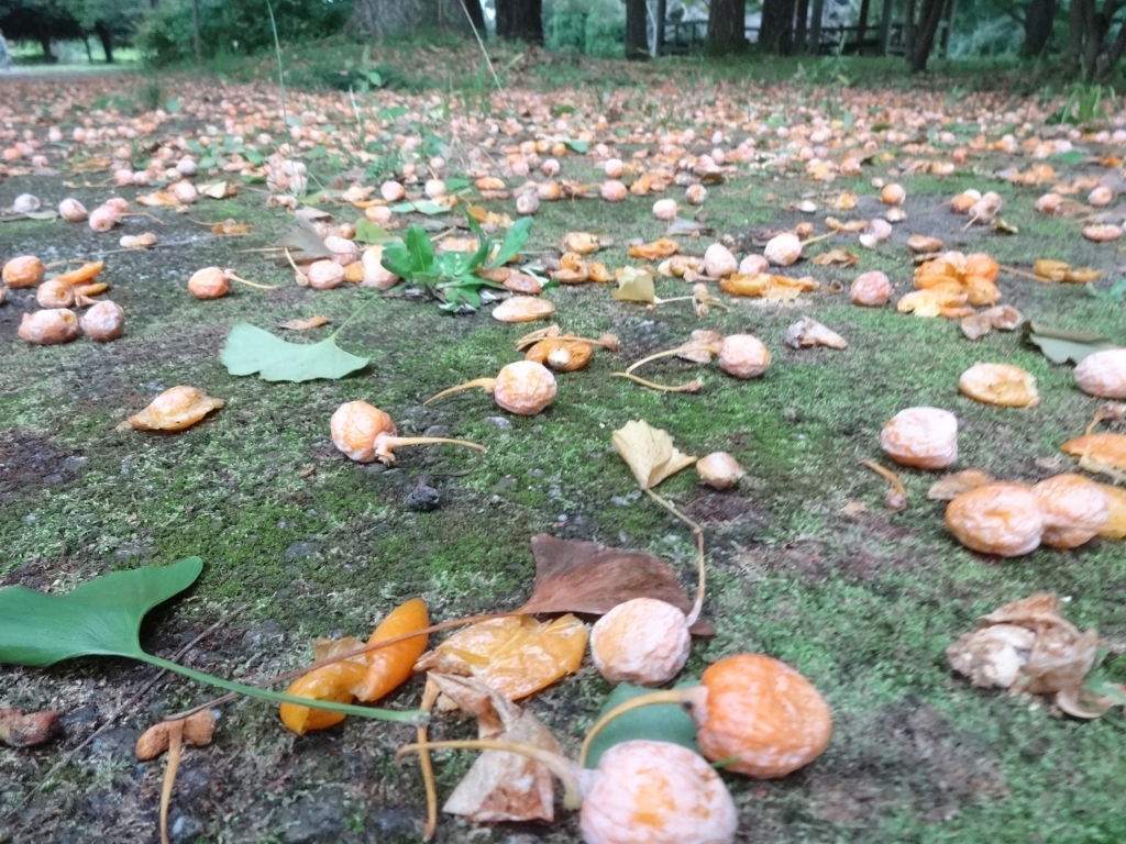 今日の昭和の森は曇っています。 ひんやりして気持ちのいい気候ですが、 夏の暑さに慣れた体には、肌寒く感じます。 先日の雨もあってか、市町村の森では、 ギンナンがたくさん落ちています。 苔むした歩道の緑といいコントラストです。 うっかり踏みつぶすと匂いがきついので、 歩行者はご注意。