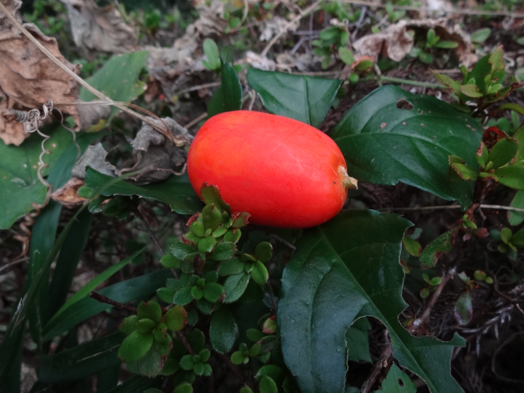 今日の昭和の森は小雨模様です。 朝方は、まだ持ちこたえていましたが、 雨が降ってきました。 昨日から一転して寒い日なので、 体調に気をつけてください。 さて、青かったカラスウリが紅くなってきました。 夏に外縁部が白く細いひも状の花を咲かせていたのが、 こんな実になるとは不思議です。