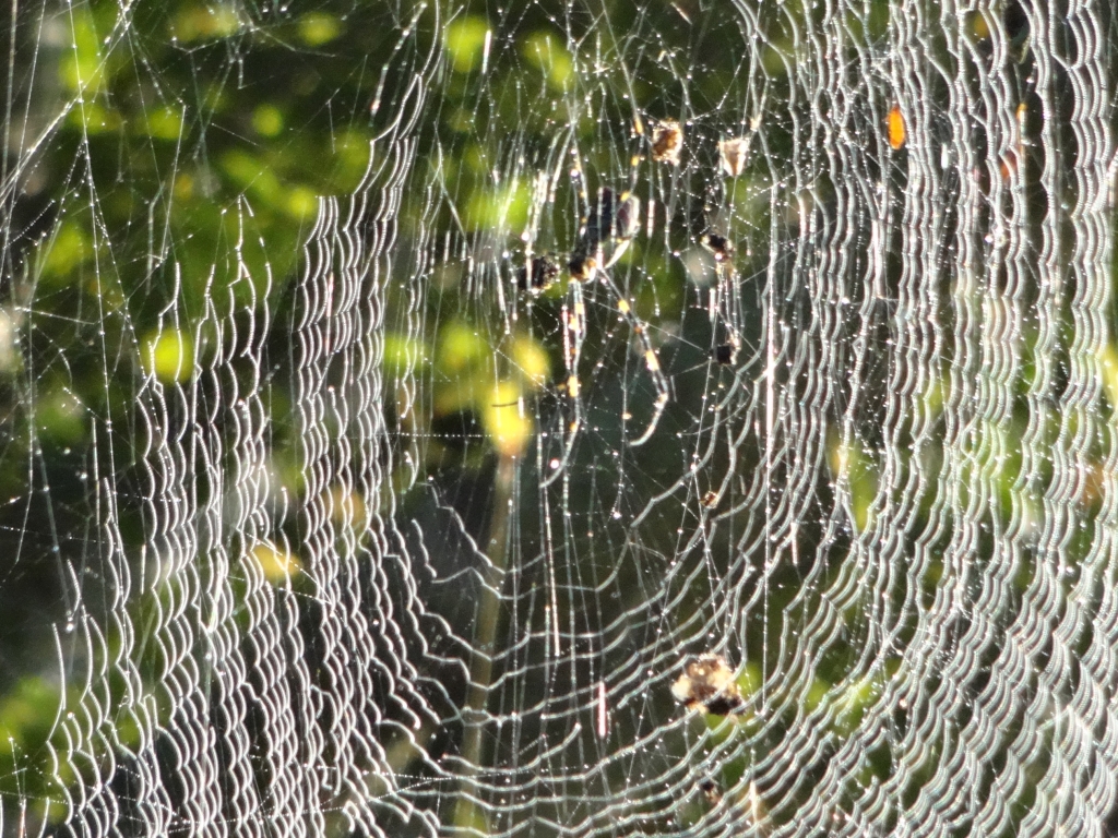 今日の昭和の森は快晴です。 3連休最終日は、絶好の行楽日和になりました。 体育の日です。 昭和の森で体を動かしましょう。 秋の天気のいい日は、蜘蛛の巣の季節です。 あちこちに光を浴びて白く輝く蜘蛛の巣に遭遇します。 この時期、とても多いです。 その巣作りは芸術的でもあります。 中には下手な巣もありますが、 風などで壊れたかもしれません。