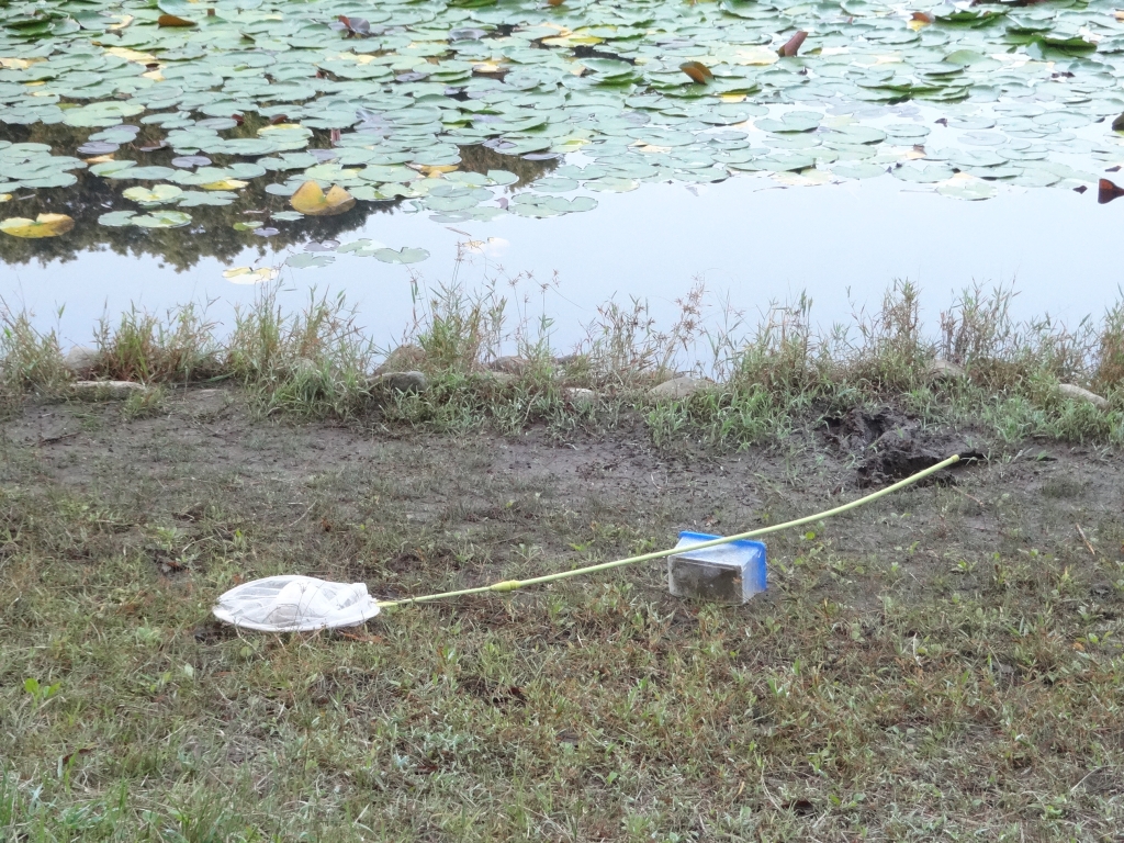 今日の昭和の森は晴れています。 雲が多く弱い風が吹いています。 真夏ほどではないですが、暑い日になりそうです。 初秋を迎えた下タ田池の淵に夏の忘れ物です。 虫取り網と虫かごです。 夏の少年の必須アイテムですね。 どちらも安く買えるようになりましたが、 大切にする姿勢が大事です。