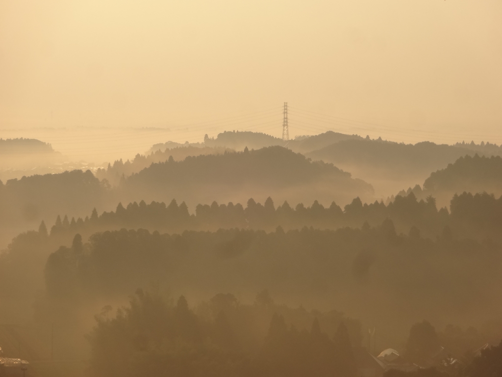 今日の昭和の森は晴れています。 風はわずか、雲が多いです。 今日も蒸し暑くなりそうです。 展望台から見る九十九里方面の眺めです。 まるで、山深い地のようです。 朝日で霧がセピア色になりました。 早朝は気温が下がったため、飽和蒸気が霧になり、 山裾の市街地を隠してしまっています。