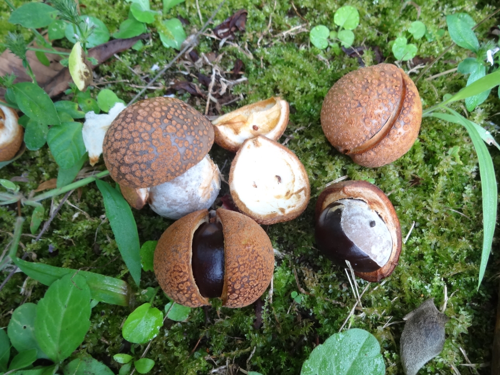 今日の昭和の森は、曇り時々晴れのようです。 今のところ、すっきりしない天気です。 早朝は湿度か高く、ムシムシしていましたが、 少し落ち着いてきました。 展望台横の栃の木が愛嬌がある実をつけていましたが、 たくさん地面に落下しています。 丸々としていて、見るからにおいしそうですが、 あくが強くて調理が難しい木の実です。