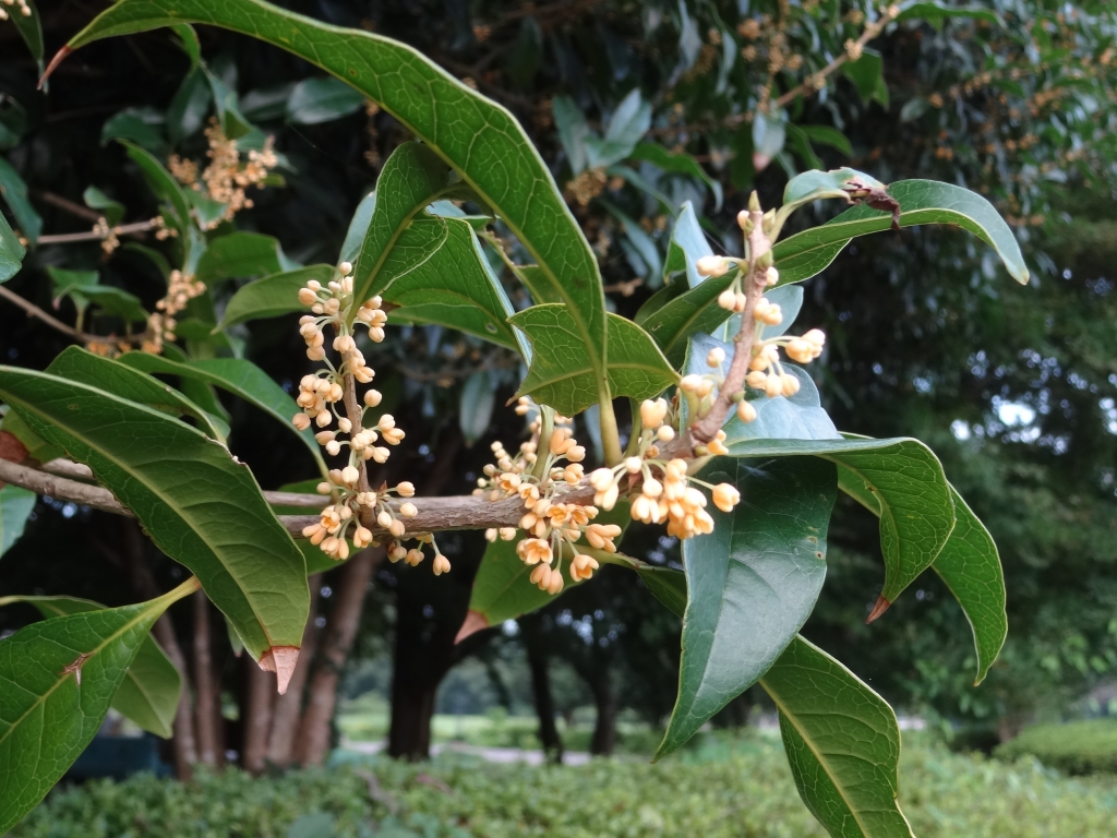 今日の昭和の森は晴れています。 連日の好天なので蒸発が多く、空はミルキー・ブルーです。 今日も暑くなりそうです。 園内やご近所をめぐっていると、どこからとなくいい香り。 金木犀のまさに「金色」の花が咲き始めたのです。 私には、青春の甘酸っぱい記憶につながります。 年配の方は、「便所」につながるかもしれません。 臭い隠しに使われていたとは言え、 初秋の一瞬しか効果はありません。 過去も現在も、いい香りです。 着々と近寄る秋の気配でし...