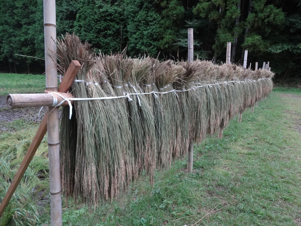 今日の昭和の森は曇っています。 たまに雨粒がポツリと落ちます。 午後は雨になりそうです。 台風が心配ですね。 昭和の田んぼも里よりは遅れて稲刈りが終わっていました。 はざかけされていますが、 こちらも台風が心配です。