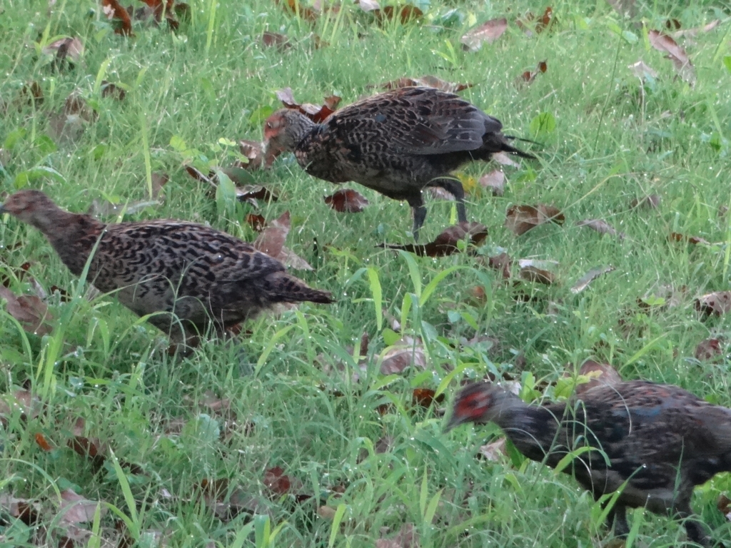 今日の昭和の森は雨模様。 風が吹く涼しい日です。 ほっと一息ですね。 雨が上がった時間帯もあったのですが、 今日は1日この調子でしょう。 メスのキジが3羽、餌をついばんでいました。 写真にいつっているのは3羽ですが、 他にも何羽かいたようです。 時々、オスを中心とした集団に出くわすことがあります。