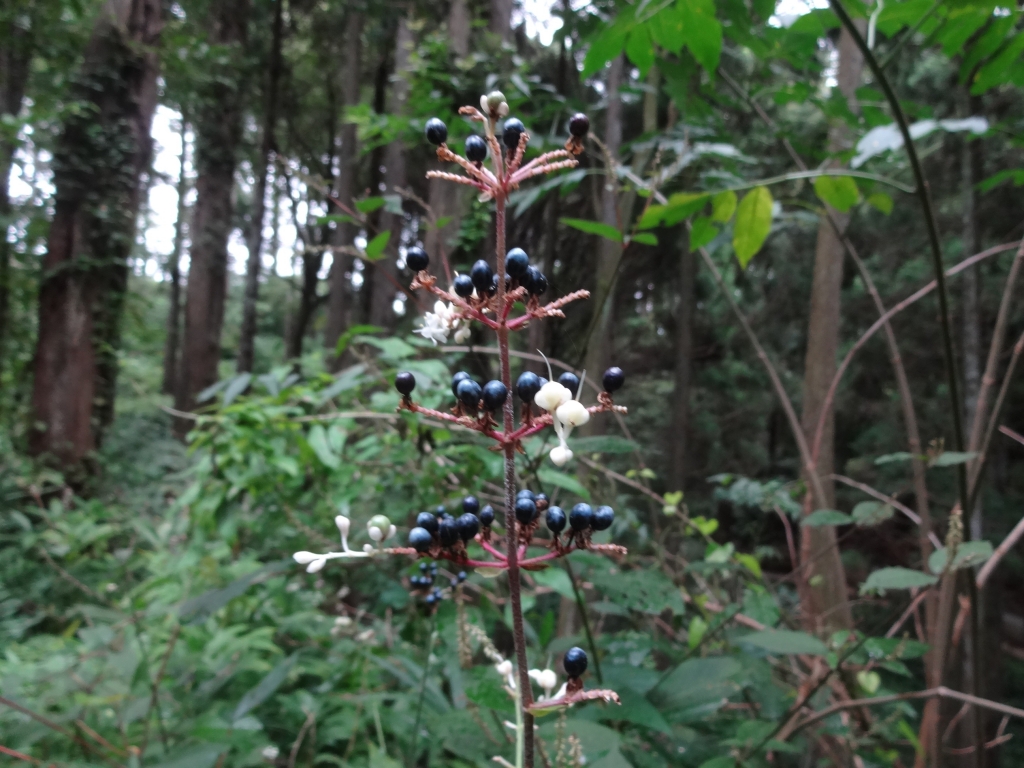 今日の昭和の森は快晴です。 秋晴れと言ってもいいくらいです。 とても爽やかです。 また少しは暑くなるのでしょうが、 野山は秋に向かって進行中です。 白い花が白い実になっていたヤブミョウガ。 その実が黒ずんできました。 白から黒へ、心変わりした訳ではないでしょうが。