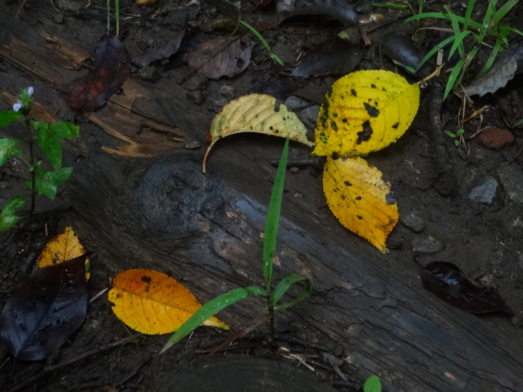 今日の昭和の森は曇っています。 昨日よりは気温が上がってきそうです。 弱い風が吹いています。 昨日の雨で野山が濡れています。 遊歩道には枯葉が落ち始めました。 暖色の枯葉は、秋の色です。 赤い葉が付いた木もあります。