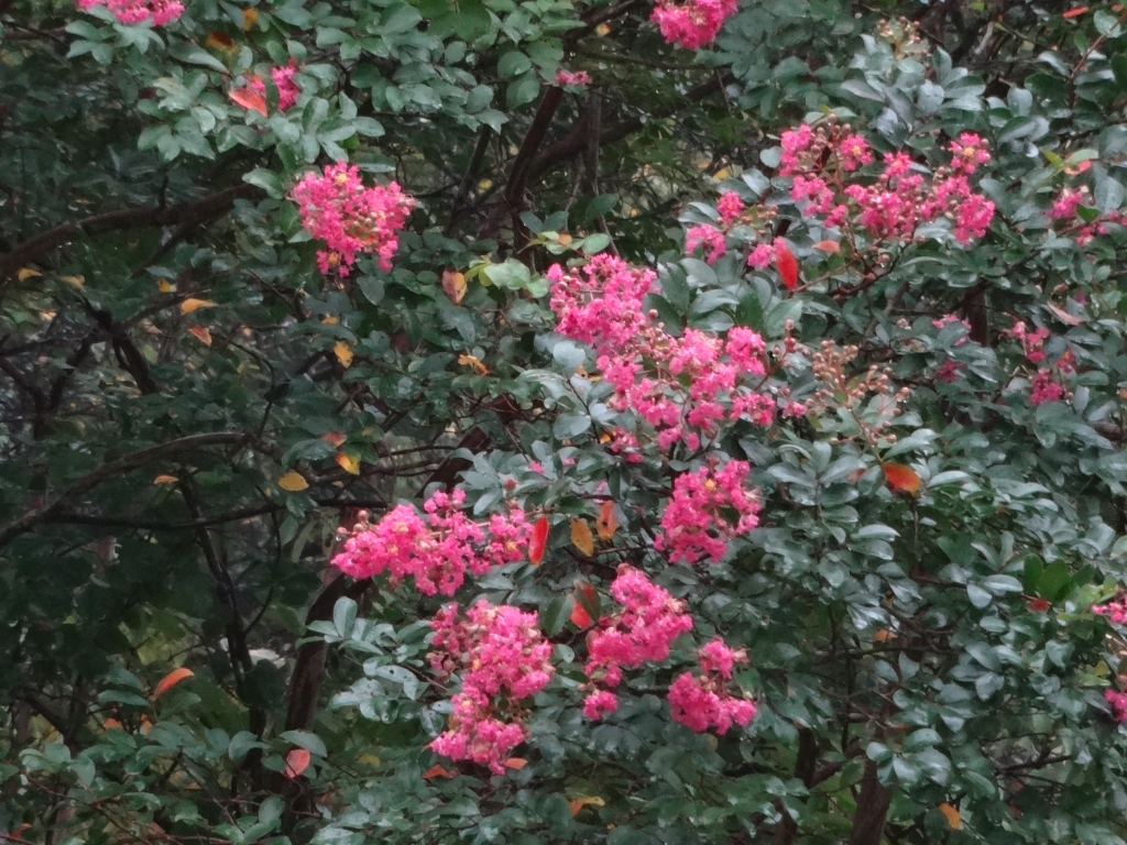 今日の昭和の森は小雨です。 しとしと降っています。 夏の花、サルスベリがまだ咲いています。 初夏から初秋までの長い間咲いている明るい花です。 そのため、「百日紅」とも呼ばれます。 こんな暗い日にも明るく元気づけてくれます。
