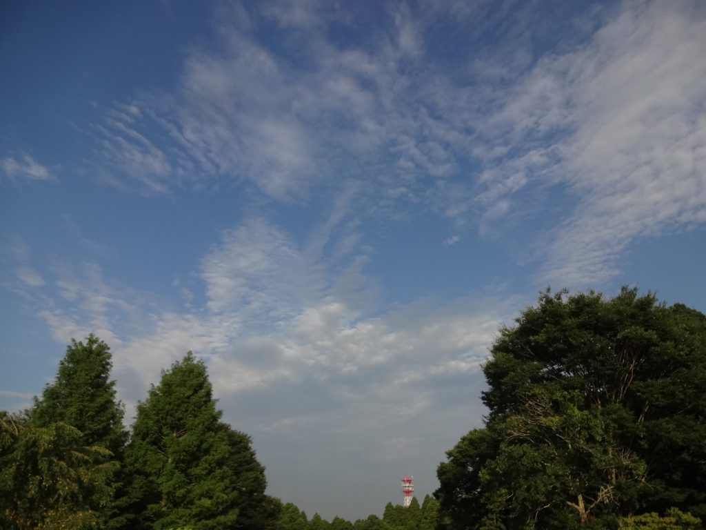 今日の昭和の森は曇っています。 早朝は晴れて爽やかでしたが、 次第に曇ってきました。 朝早く見上げる空は青空に秋雲が模様をつけていました。 高度が高い所にある鱗雲です。 その下をグレーの雲が流れていきます。 気温が高くなると更に雲が増えてきます。