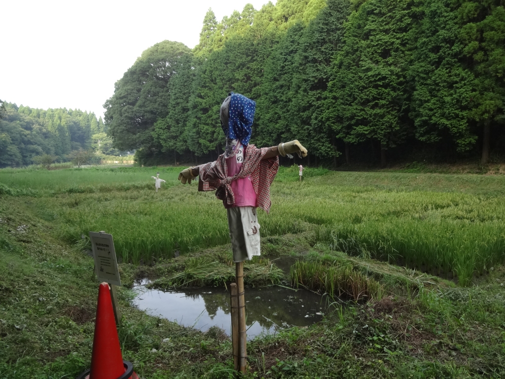 今日の昭和の森は薄曇りです。 時折陽が差す、暑い日です。 房総半島の稲刈りは早いですが、 ここ昭和の森の田んぼももうじきでしょうか。 今年もユーモラスな案山子が何体か登場しています。 一体ずつ名前を付けたいですね。