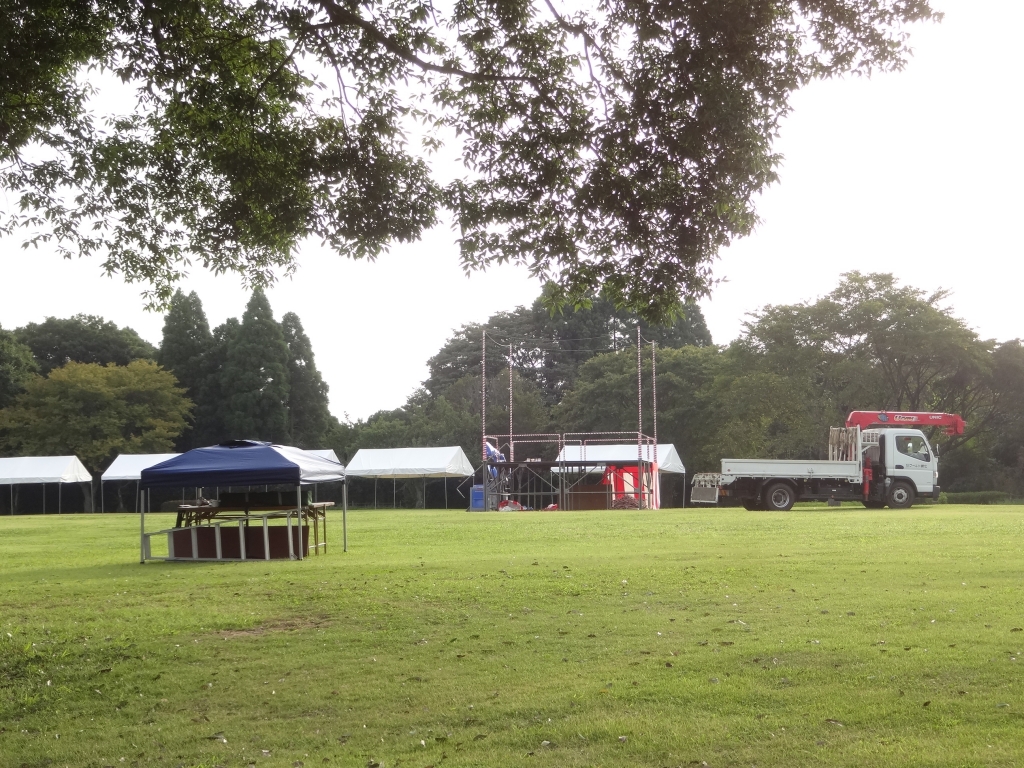 今日の昭和の森は薄曇りです。 とても暑いです。 明日8月26日(土)は、昭和の森 大花火大会です。 ご覧のように前日早朝から準備が開始されていました。 午後は特に熱くなるので、 作業する方々は暑さ対策が肝心です。 ここは、海辺と違って木陰があるのが救いです。