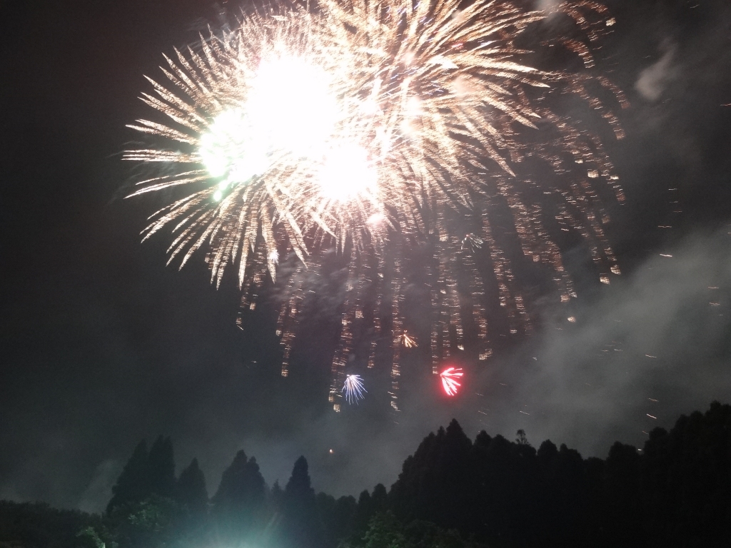 今日の昭和の森は曇っています。 涼しいです。 夏の終わりと言う風情です。 昨夜の花火で盛り上がった後の、「祭りのあと」です。 夜は、一時的に雨が降りました。 よくそれまでもってくれました。 写真は、その花火大会の様子です。 森のシルエットの上に大輪の花火が輝いていました。 花火大会の前には、盆踊りや演芸が行われました。 この花火大会は、土気商工会が主催です。 1週間前には、自治会主催の祭りで花火が上がっています。 「花火」は、一つ...