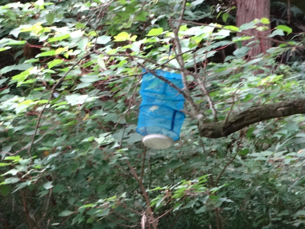 今日の昭和の森は薄曇りです。 時折、日が差します。 今朝は涼しかったですね。 湿性植物園の上部に白く濁った小さな池があります。 その上に干物や食器乾燥に使うような干しかごが吊るされていました。 ここのところ何回か見かけるのですが、何をしているのでしょうか。 撤収されて干しかごが無い時もあるので、 誰かが何かの意図で吊るしているのですね。 もしご存知の方がいらしたら、教えてください。