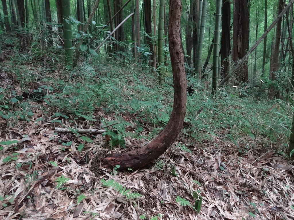 今日も昭和の森は曇っています。 今にも雨が降り出しそうです。 今時、梅雨前線が日本列島を横たわっているんです。 暑くはないですが、湿度が高いのは体に堪えます。 林に中で、いい具合に曲がった杉を見つけました。 ちょっと、曲がり過ぎですね。 反対側から見ると、平仮名の「し」の字に見えるでしょう。 成長時に何か障害物があったのでしょうか。 人なら、障害を跳ね除けて成長すると言いますが。