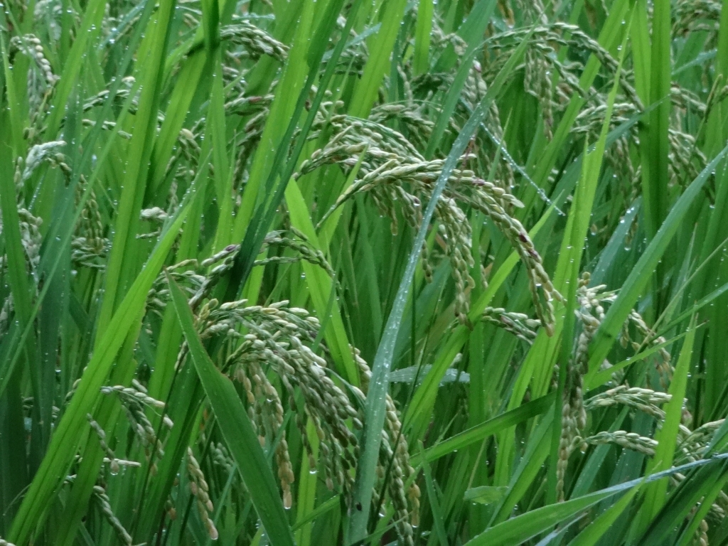 今朝の昭和の森は小雨です。 こんな日が続きますね。 午後には回復する予報です。 お盆休みの人が多いと思いますが、 どのように過ごしているのでしょうか。 お盆の食べ物と言えば、かき氷にブドウ。 こんな天気だとかき氷は積極的には食べたくないですね。 それでも稲は育っています。 雨に濡れて成長した穂が垂れていました。 房総半島は温暖なので、 お盆前後から稲刈りするところがあります。