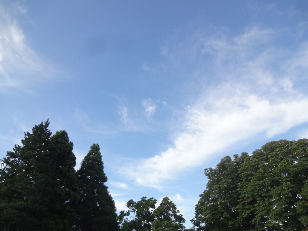 今日の昭和の森は曇っています。 蒸し暑くなってきました。 ここのところ、雨続きだったのですが、 早朝は見事な青空でした。 上空、高い所には鱗雲のような雲もあり、 お盆を過ぎて秋が近づいている気配を感じました。 しかし、このまま秋になっては拍子抜けです。 アクティブな方はフラストレーションがたまるでしょう。 湿度の低い晴天が1週間くらい続くと嬉しいですね。