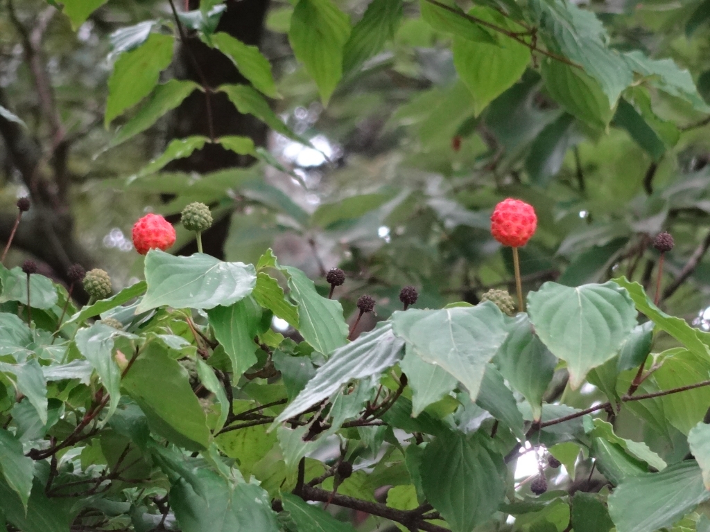 今日の昭和の森は曇っています。 こんなグレーなお盆は何年かに一度はありますね。 気を取り直していきましょう。 夏前に白い花を咲かせていた ヤマボウシの実が赤くなってきました。 待ち針のようでかわいらしいです。