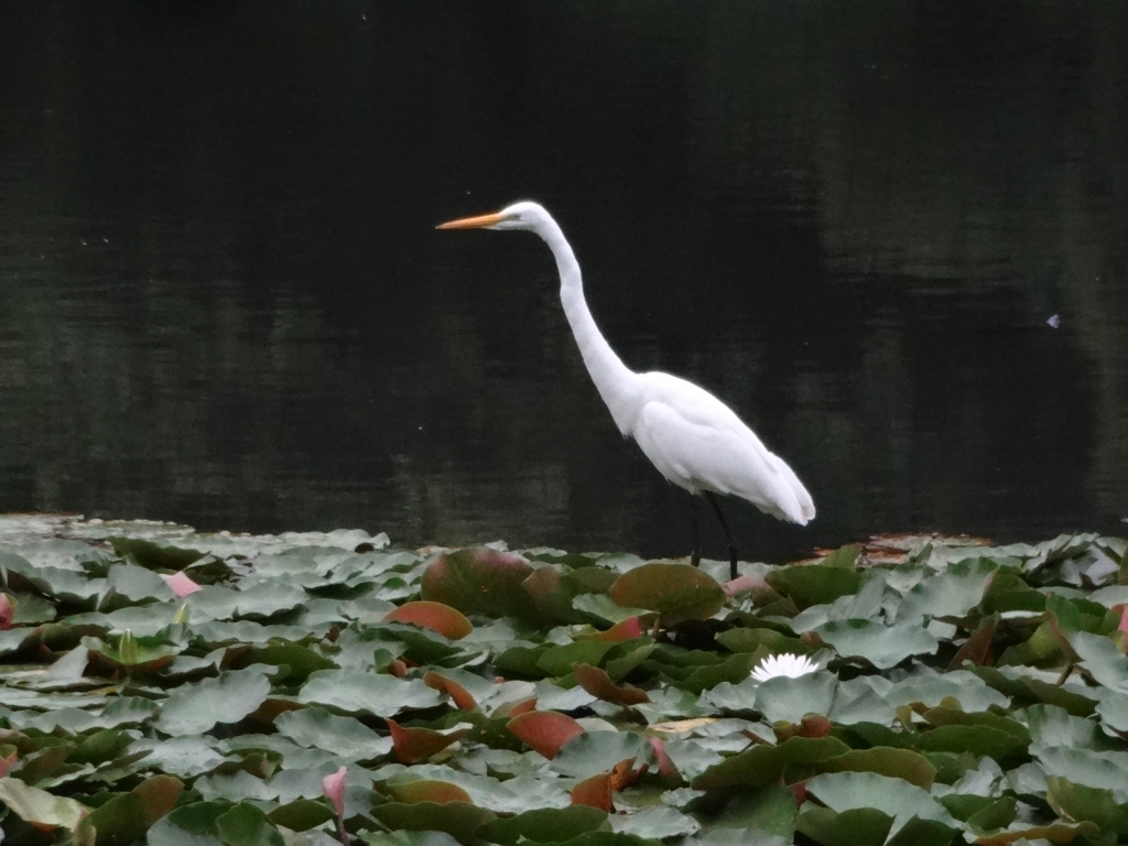 今日も昭和の森は曇っています。 時折、雨がぱらつきます。 涼しい日です。 下タ田池に白鷺が2羽いました。 器用に睡蓮の上を歩いています。 首を曲げたり延ばしたり。 何かを狙っているようでした。