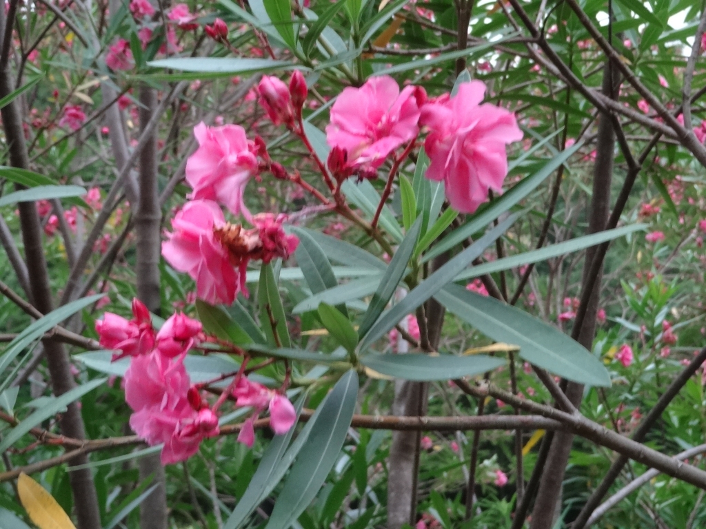 今日の昭和の森は薄曇りです。 蒸し暑いです。 夾竹桃が植えてあるのは、市町村の森だけでしょうか。 鮮やかな紅色で枝も葉もスリムで、夏の花と言う印象です。 高速道路や国道脇にもよく植えられています。 夾竹桃を見ると、夏のドライブと言う印象があります。 そういった場所に植えられるのは、大気汚染に強いからです。 高度成長期に大気汚染のひどい都市では、 大きな道路脇に盛んに植えられました。 ただし、毒性に注意です。 花や葉を含むすべてに毒...