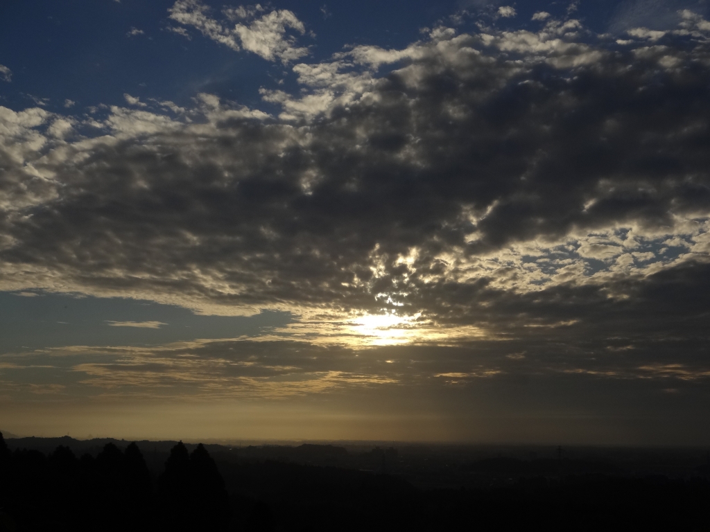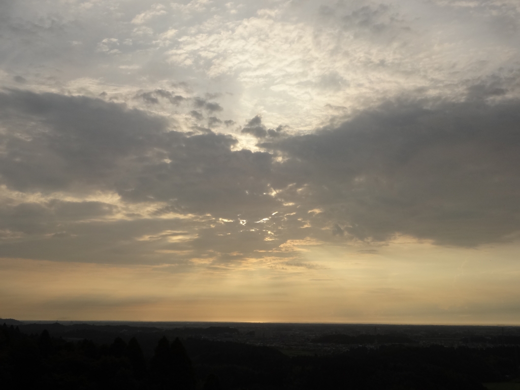 今日の昭和の森は曇っています。 早朝は、まだ少しだけ青空が覗いていました。 展望台から見る太平洋の上空には雲がかかっていました。 雲は高い所にも低い所にもありました。 所々、朝陽が漏れ出て輝いていました。